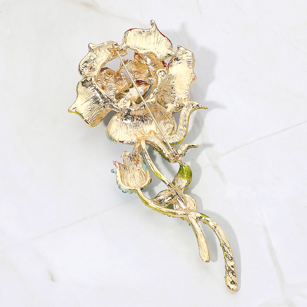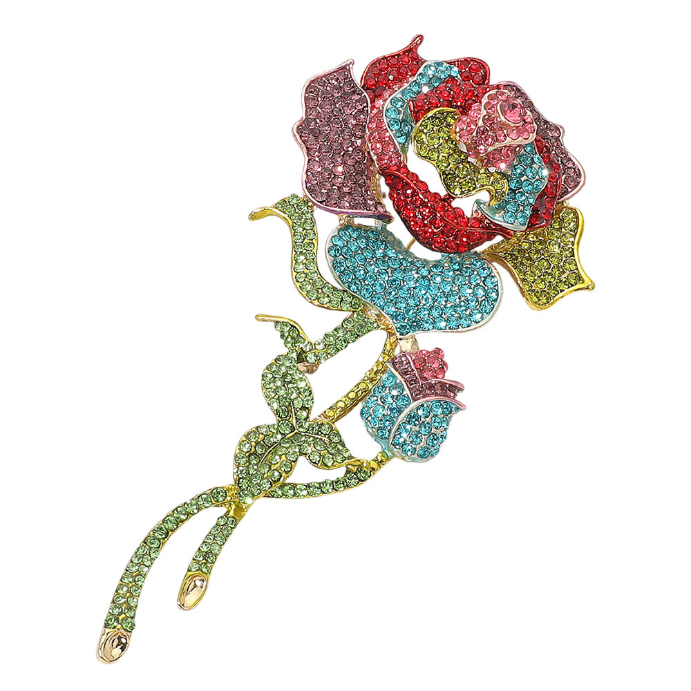 • Chic rhinestone rose brooch featuring a detailed floral silhouette with shimmering stones on the petals, stem, and leaves. Perfect for accessorizing jackets, dresses, scarves, or bags with a refined and eye-catching statement touch.