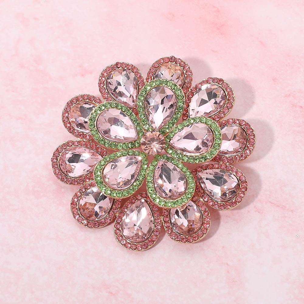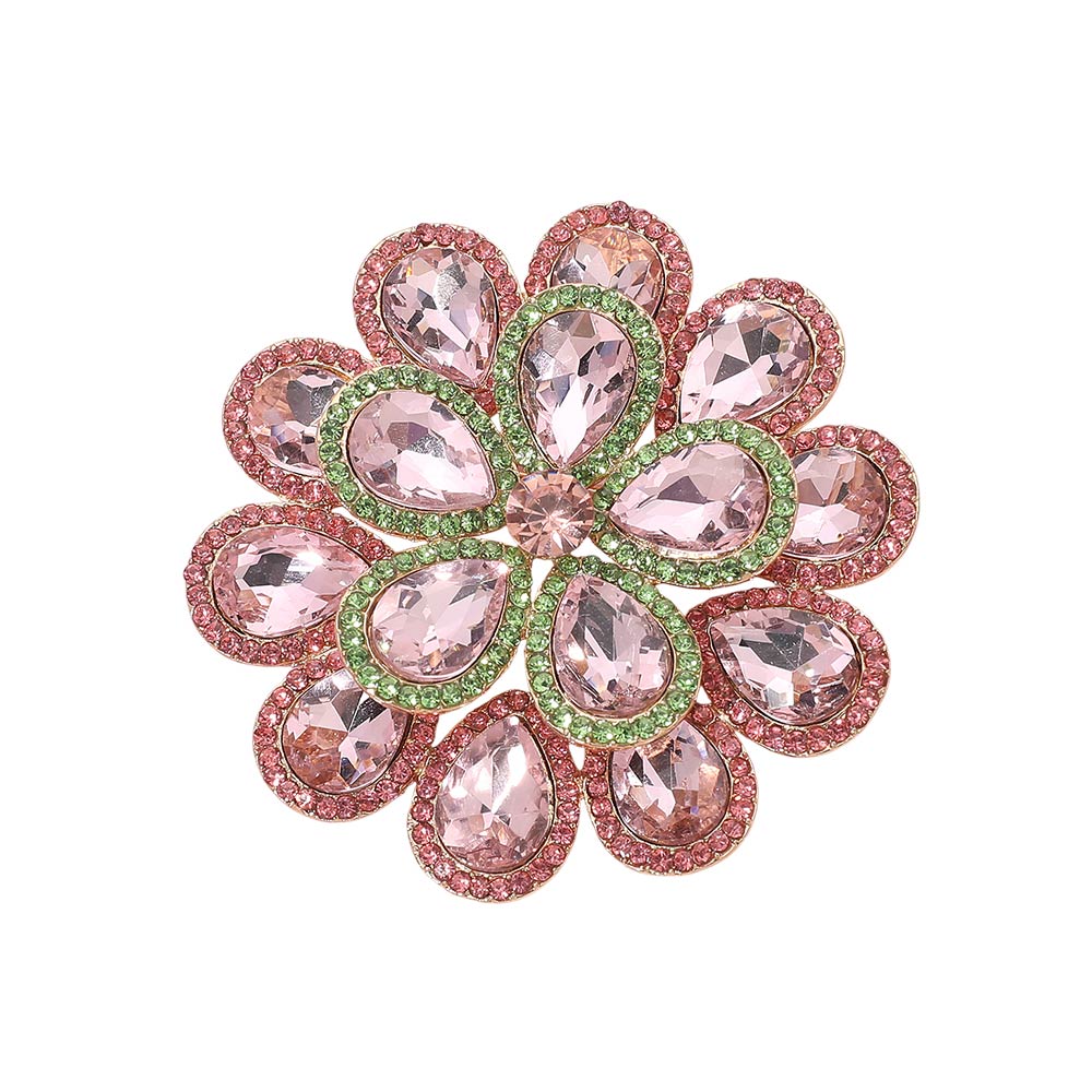 Details • Size : 2.6" X 2.6" • Pin Brooch • Eye-catching floral brooch designed with layered teardrop-shaped crystal accents forming a radiant flower silhouette. A bold statement piece ideal for jackets, dresses, scarves, and special occasion styling, perfect for gifting or elegant everyday looks. • Lead and Nickel Compliant