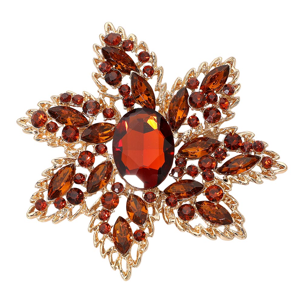 • This ornate floral brooch features an intricately layered design with a bold faceted centerpiece surrounded by shimmering accents. Its radiant, sculpted silhouette adds a refined touch to formalwear, evening outfits, or special-occasion ensembles, creating a timeless statement full of sophistication.