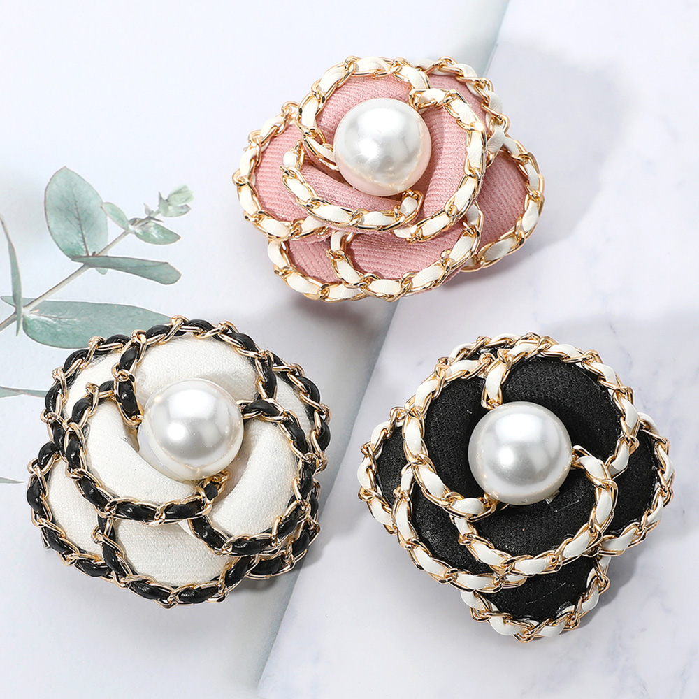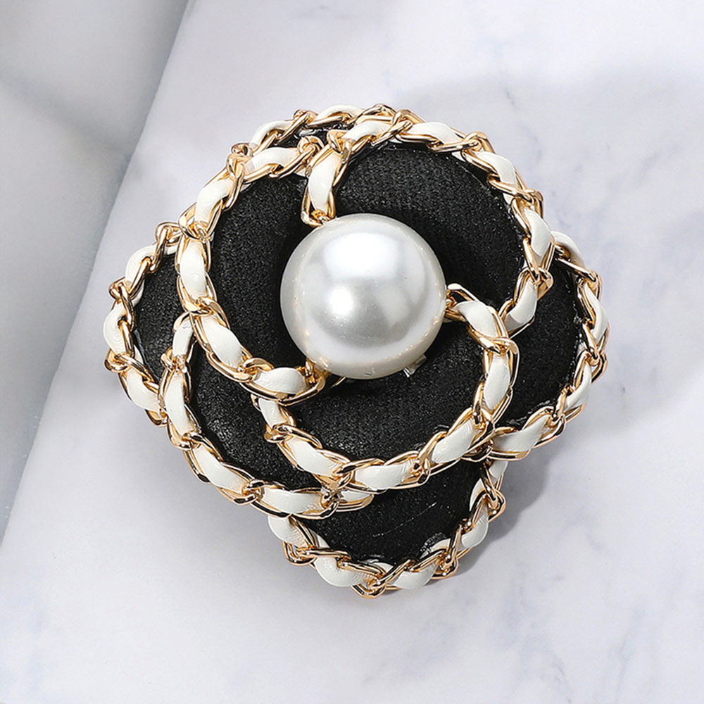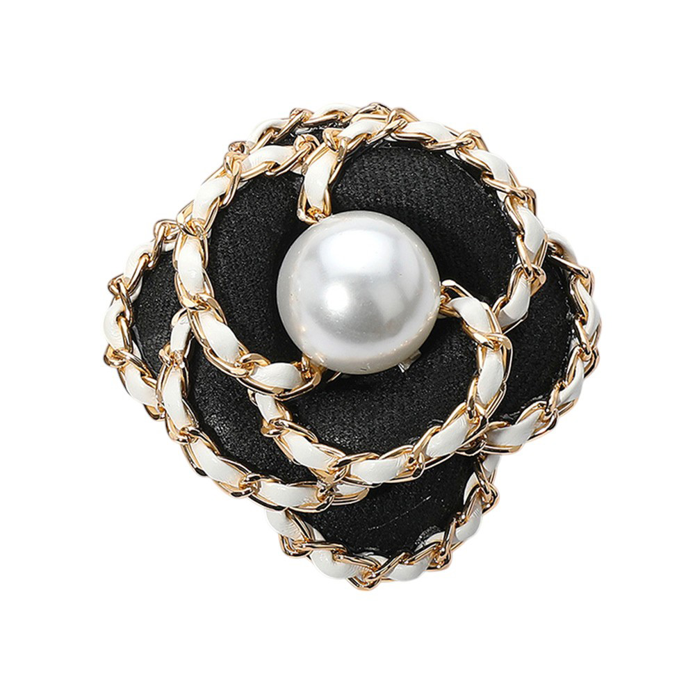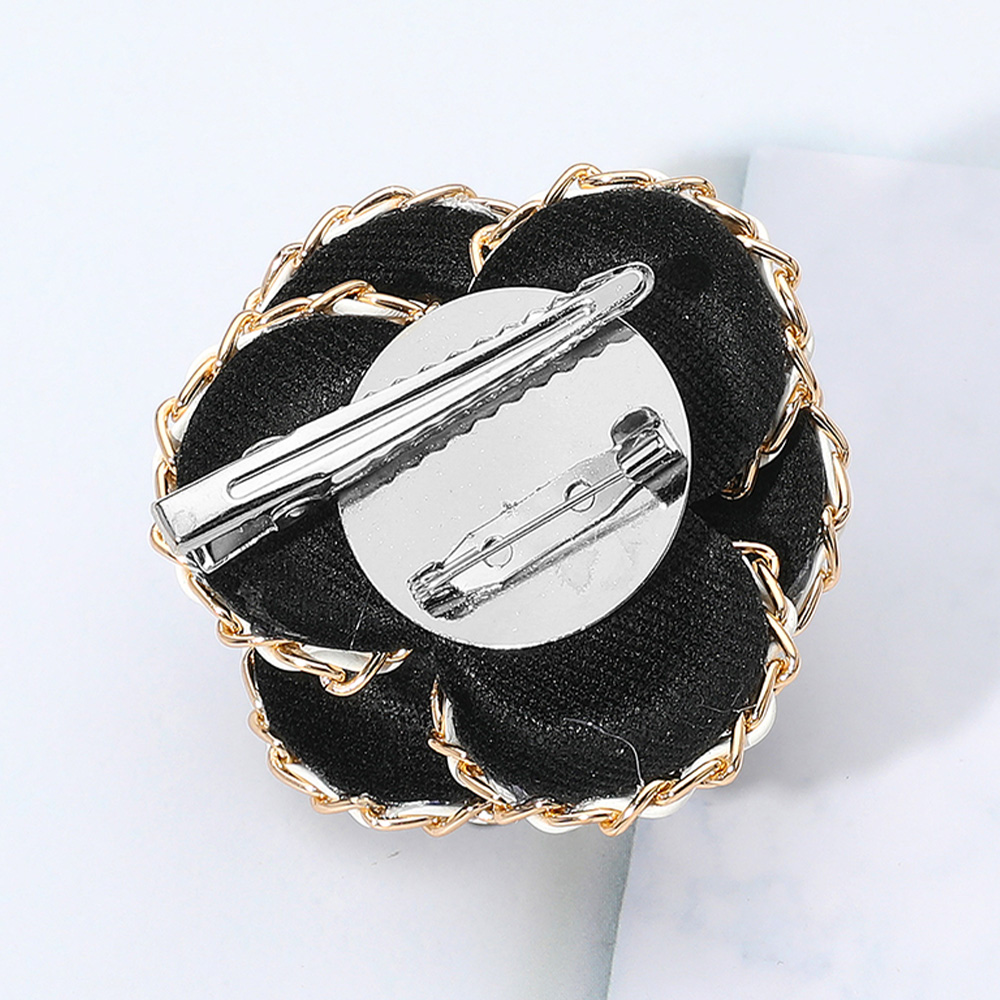 Details • Size : 2.5" X 2.5" • Dual : Brooch / Hair Pinch Clip • Elegant flower brooch featuring a black fabric base with white chain trim and a central pearl accent, complete with dual clip fastening. Perfect for adding sophistication to jackets, dresses, or accessories.
