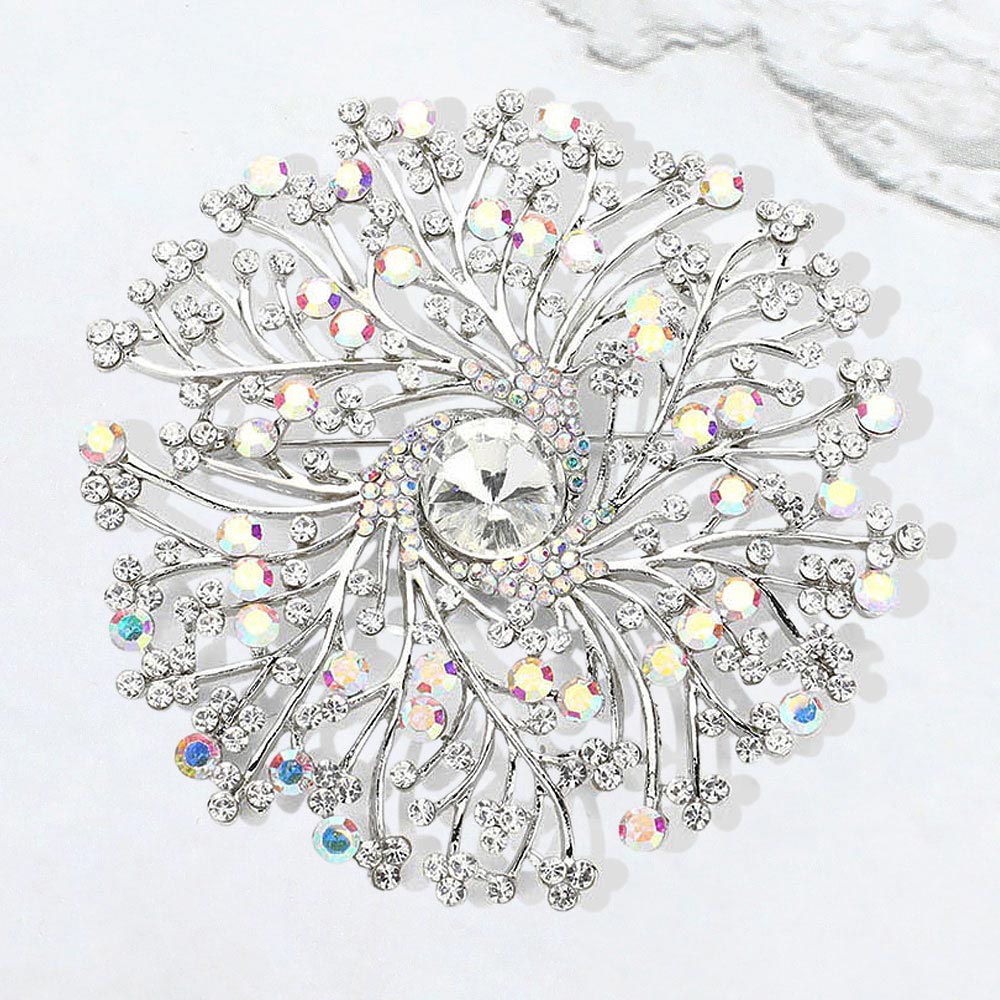 Details • Size : 3.6" X 3.6" • Pin Brooch • A dazzling brooch featuring an intricate burst design that captures light beautifully for an elegant, eye-catching finish. Perfect for adding a refined touch to formal wear, accessories, or special-occasion outfits with its sparkling, detailed craftsmanship. • Lead and Nickel Compliant