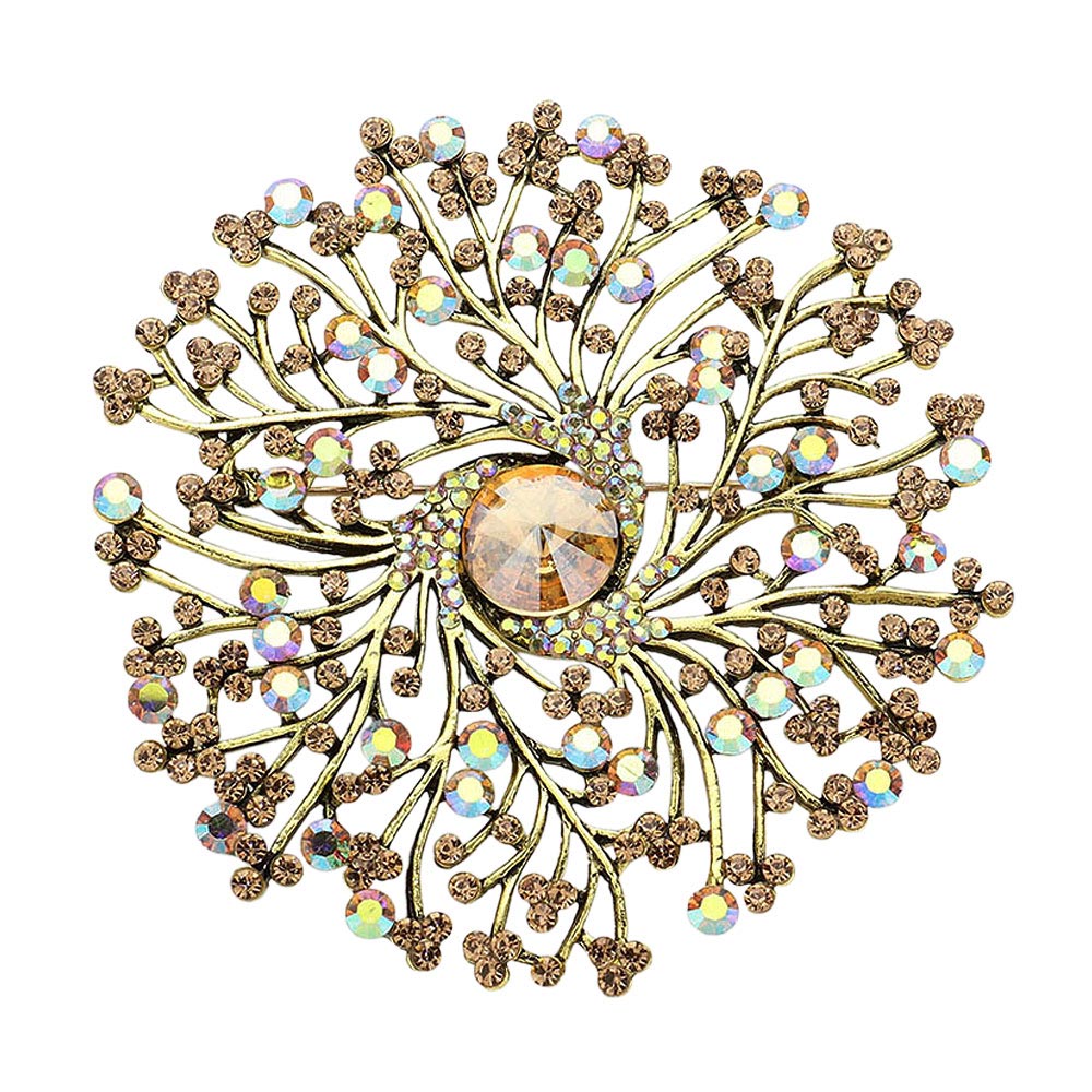Round Stone Centered Rhinestone Embellished Branch Flower Pin Brooch