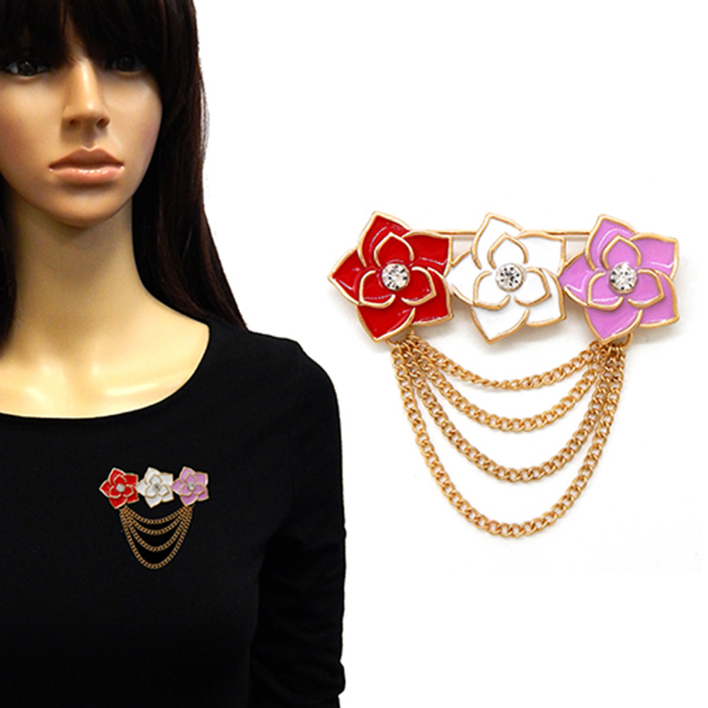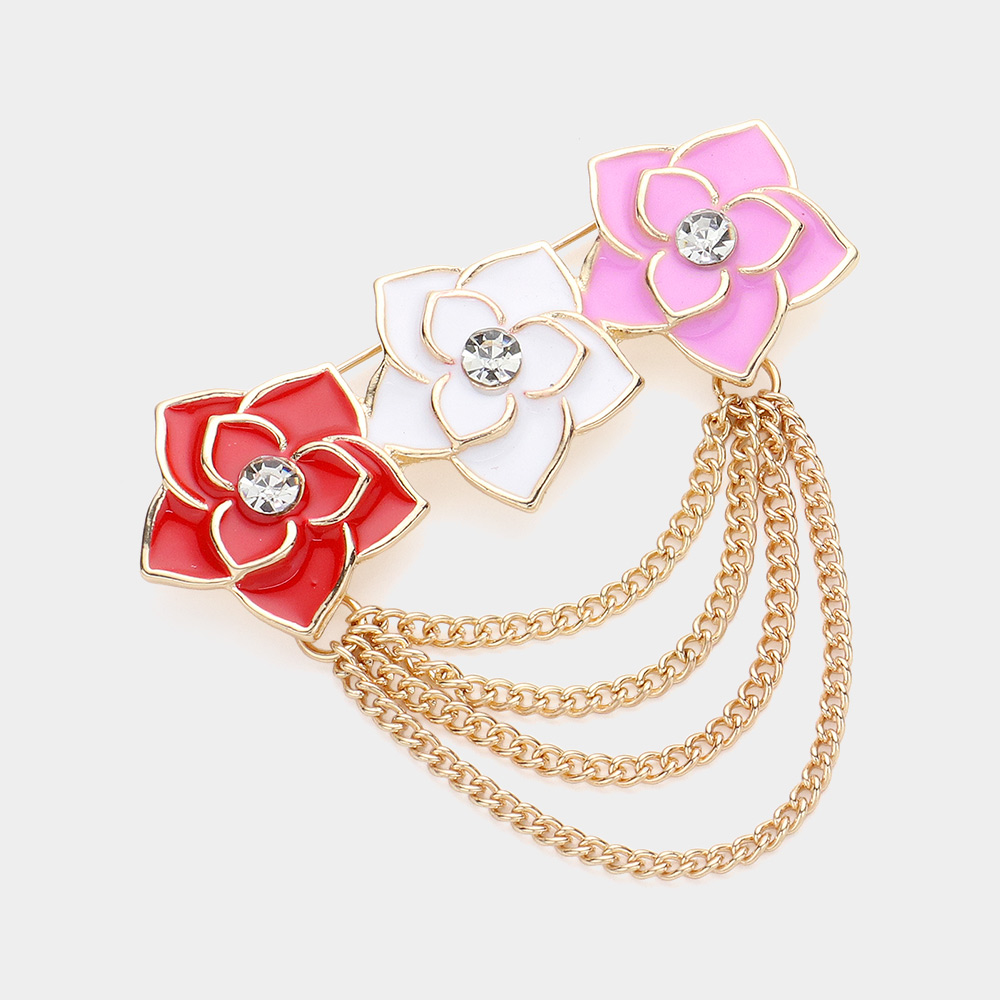 Stone Pointed Triple Enamel Flower Chain Brooch