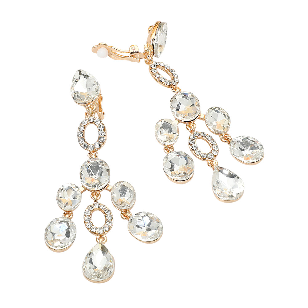 • Statement chandelier earrings featuring cascading faceted accents with a clip-on design for comfortable, secure wear. Ideal for special occasions, evening looks, and boutique collections, offering elegant movement, eye-catching sparkle, and versatile styling appeal without pierced ears.