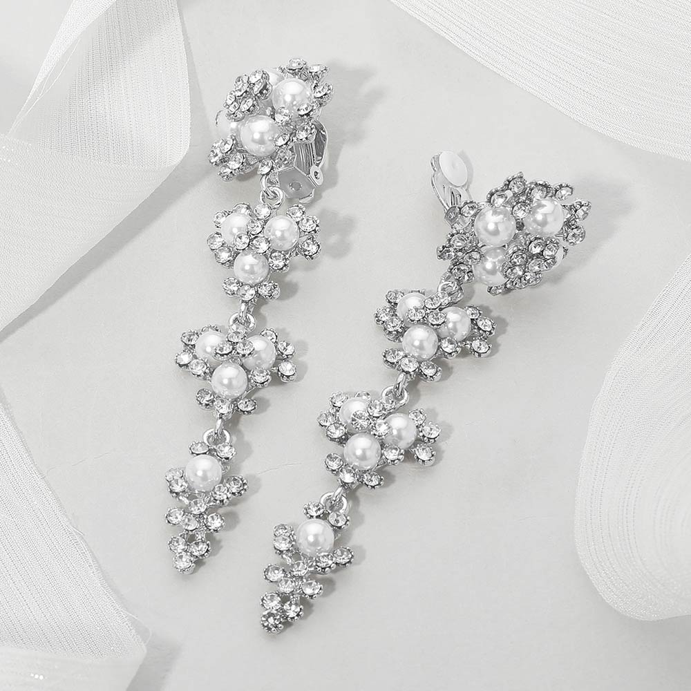 Floral Pearl Rhinestone Cluster Drop Evening Clip On Earrings