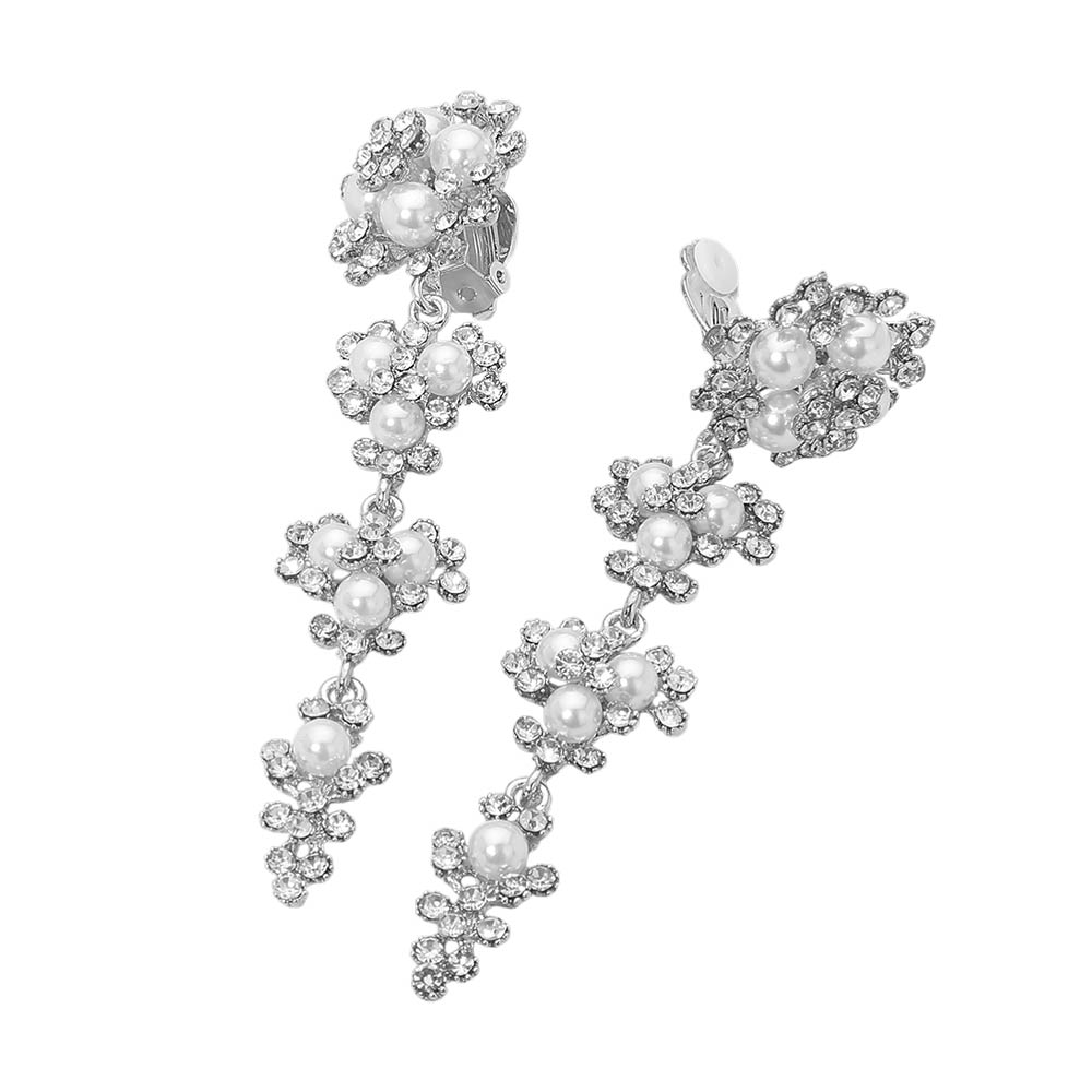 • Stunning floral drop clip on earrings featuring layered pearls and sparkling rhinestones. Lightweight yet bold design perfect for weddings, parties, or elevating everyday outfits. Comfortable post-back fit.