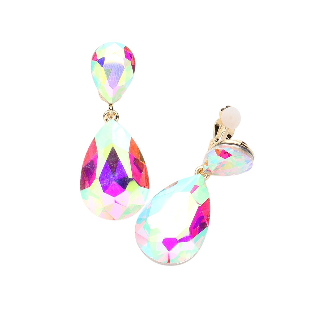 Glass Crystal Double Teardrop Clip on Evening Earrings