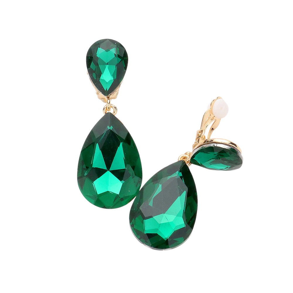 Glass Crystal Double Teardrop Clip on Evening Earrings