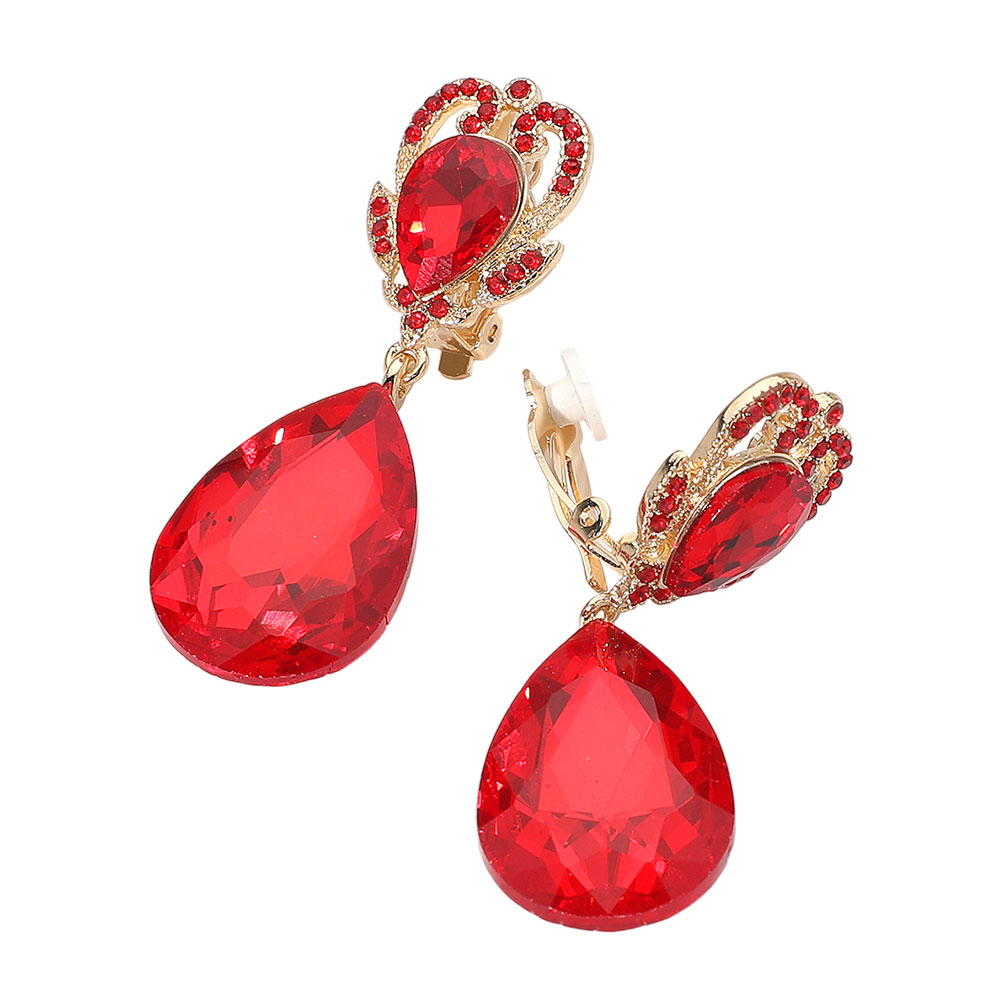 • Bold clip-on statement earrings featuring a large faceted teardrop drop and an ornate decorative top for an elegant, dramatic look. Designed for comfortable wear without piercing, perfect for evening events, formal outfits, or adding a touch of glamour.