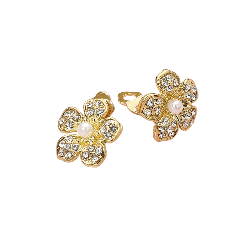 Details • Size : 0.75" X 0.75" • Clip On • Bring a radiant floral touch to your look with these elegant clip-on earrings featuring a five-petal crystal design and a delicate pearl at the center. Perfect for special occasions or everyday elegance, they offer sparkle, comfort, and sophistication without pierced ears. • Lead and Nickel Compliant