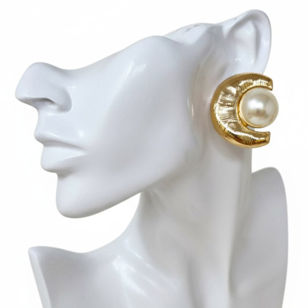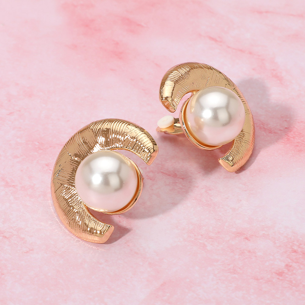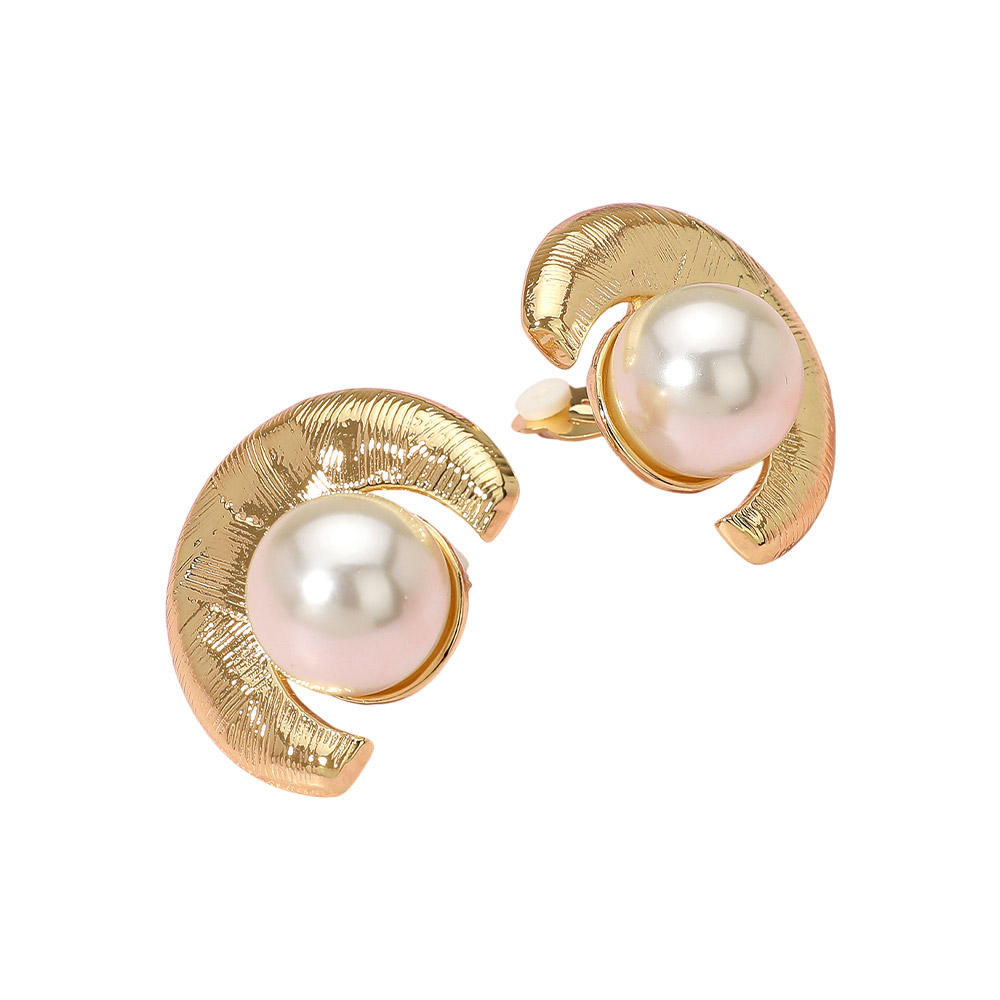 Pearl Accent Textured Curved Metal Clip On Earrings
