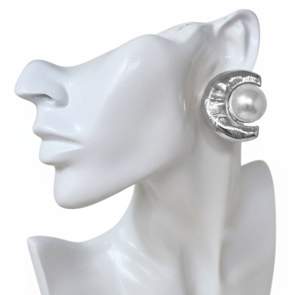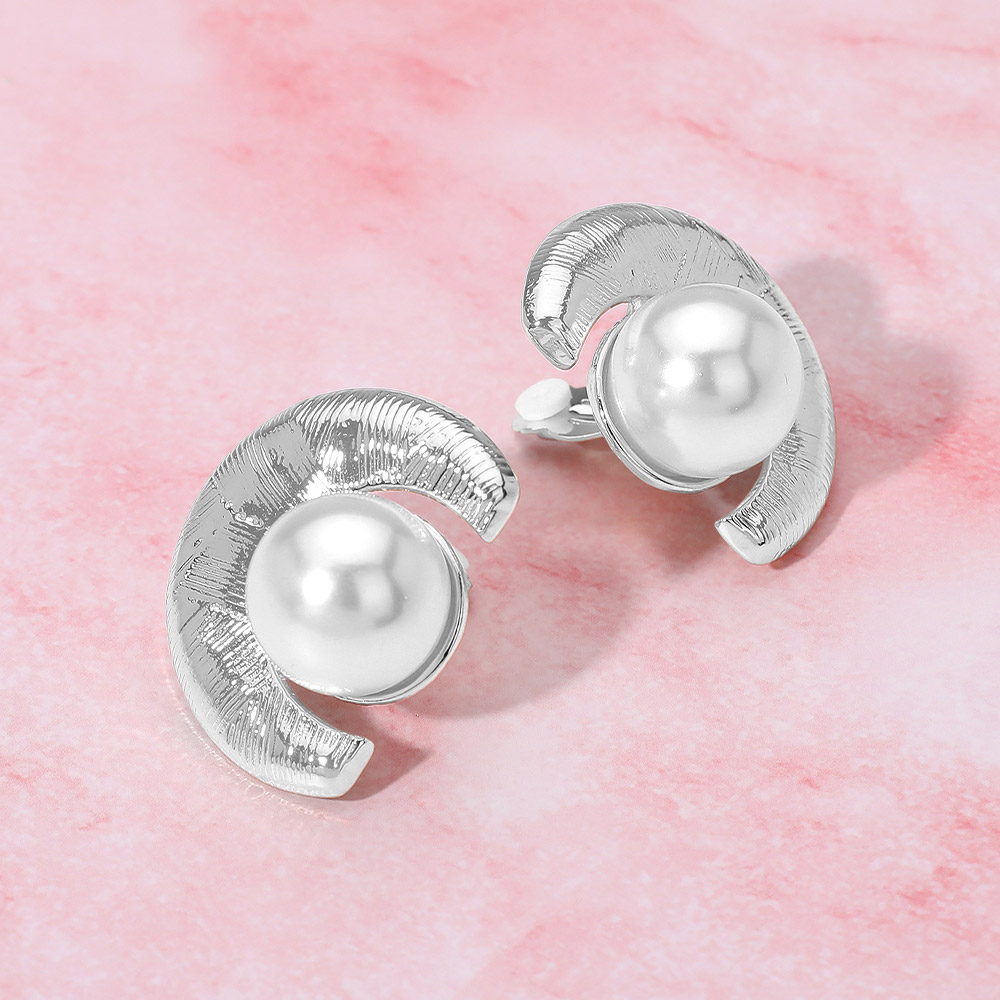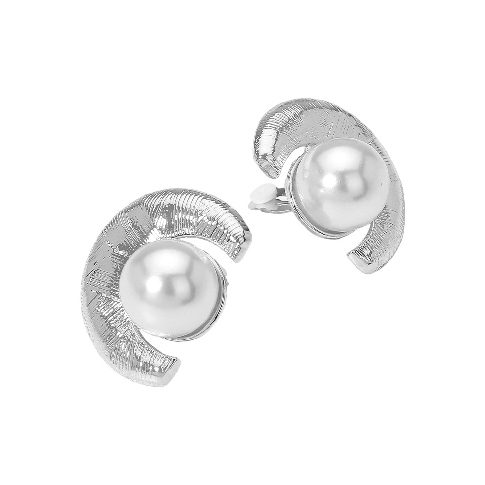 Pearl Accent Textured Curved Metal Clip On Earrings