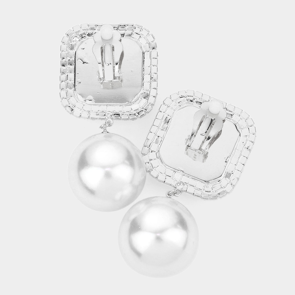 Square Stone Pearl Link Dangle Evening Clip on Earrings
