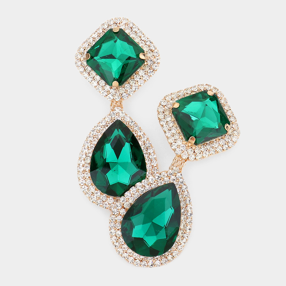 Square Teardrop Stone Accented Dangle Evening Clip on Earrings