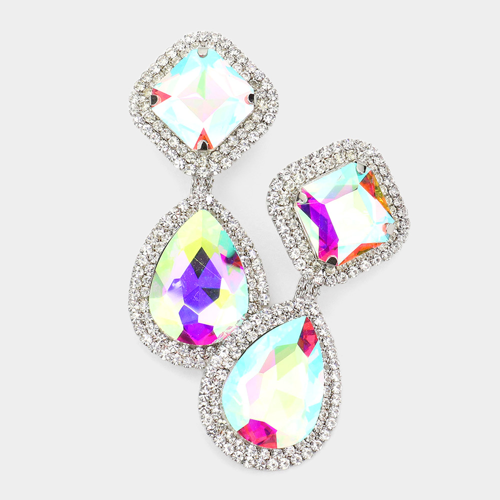 Square Teardrop Stone Accented Dangle Evening Clip on Earrings