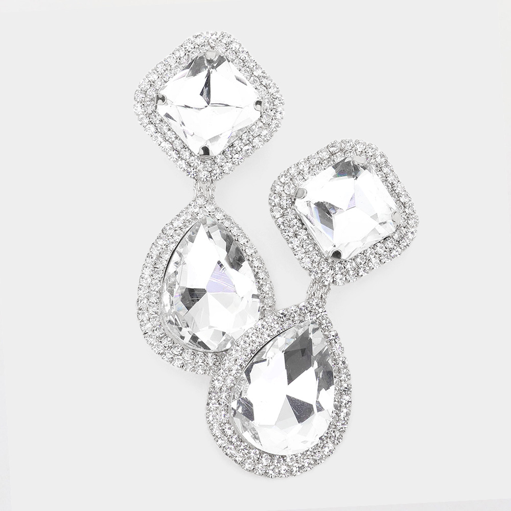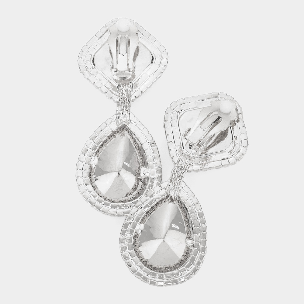 Square Teardrop Stone Accented Dangle Evening Clip on Earrings