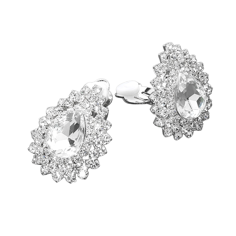 • Glamorous teardrop crystal cluster clip-on earrings designed with a sparkling layered halo for a radiant, eye-catching finish. Their elegant, non-pierced design offers comfortable wear for formal events, parties, bridal looks, or any occasion that calls for a touch of refined brilliance.