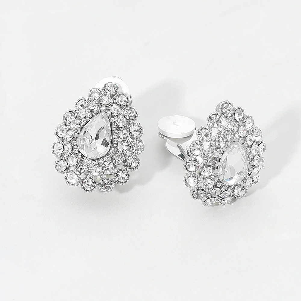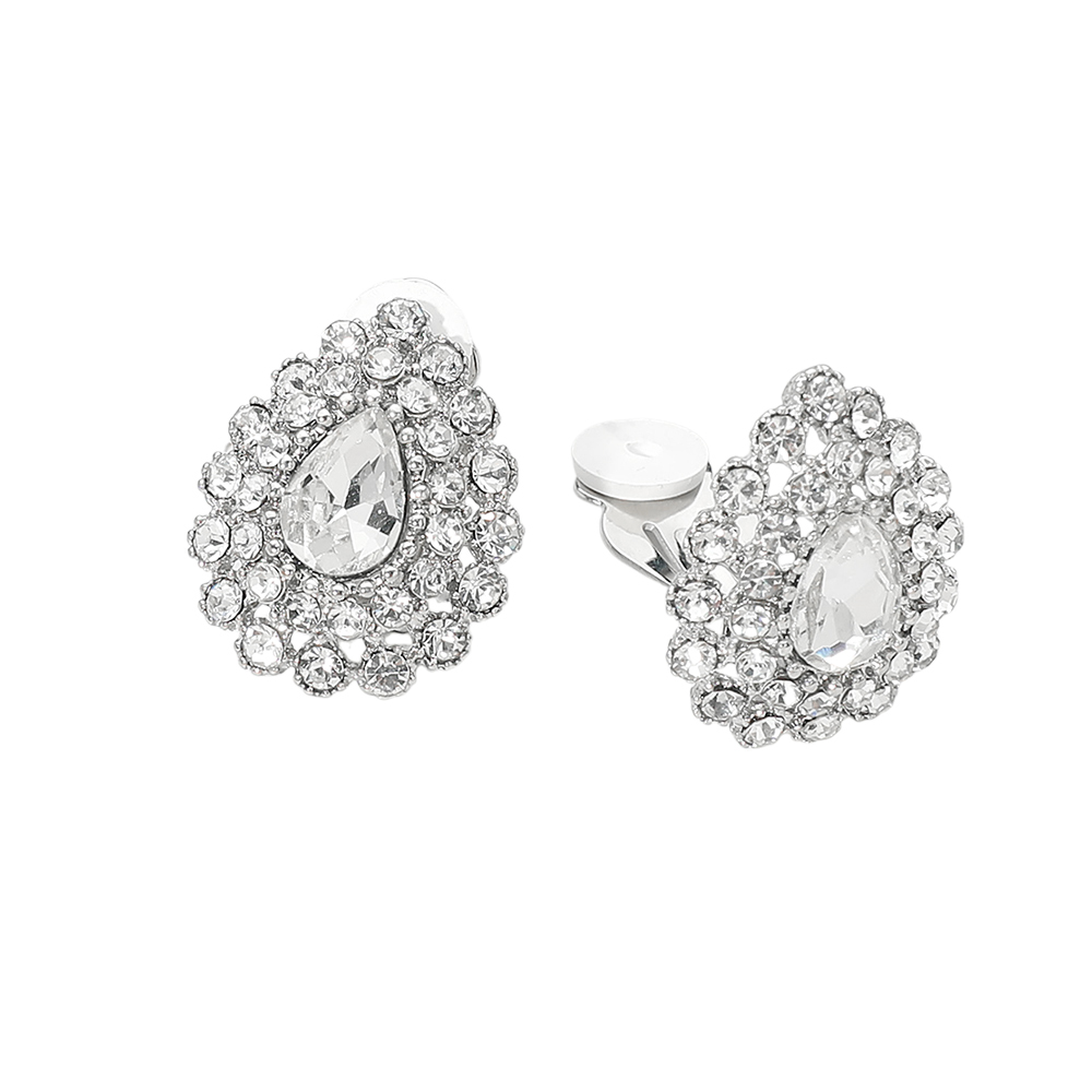 Details • Size : 0.75" X 1" • Clip On • Crystal teardrop cluster clip earrings featuring a classic halo-inspired design that adds instant elegance to any look. Designed for comfortable, secure wear without piercings, perfect for special occasions or elevated everyday styling. Ideal for boutiques seeking timeless, dressy statement earrings with refined appeal. • Lead and Nickel Compliant