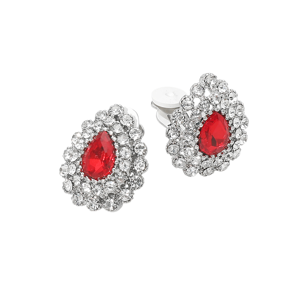 Details • Size : 0.75" X 1" • Clip On • Crystal teardrop cluster clip earrings featuring a classic halo-inspired design that adds instant elegance to any look. Designed for comfortable, secure wear without piercings, perfect for special occasions or elevated everyday styling. Ideal for boutiques seeking timeless, dressy statement earrings with refined appeal. • Lead and Nickel Compliant
