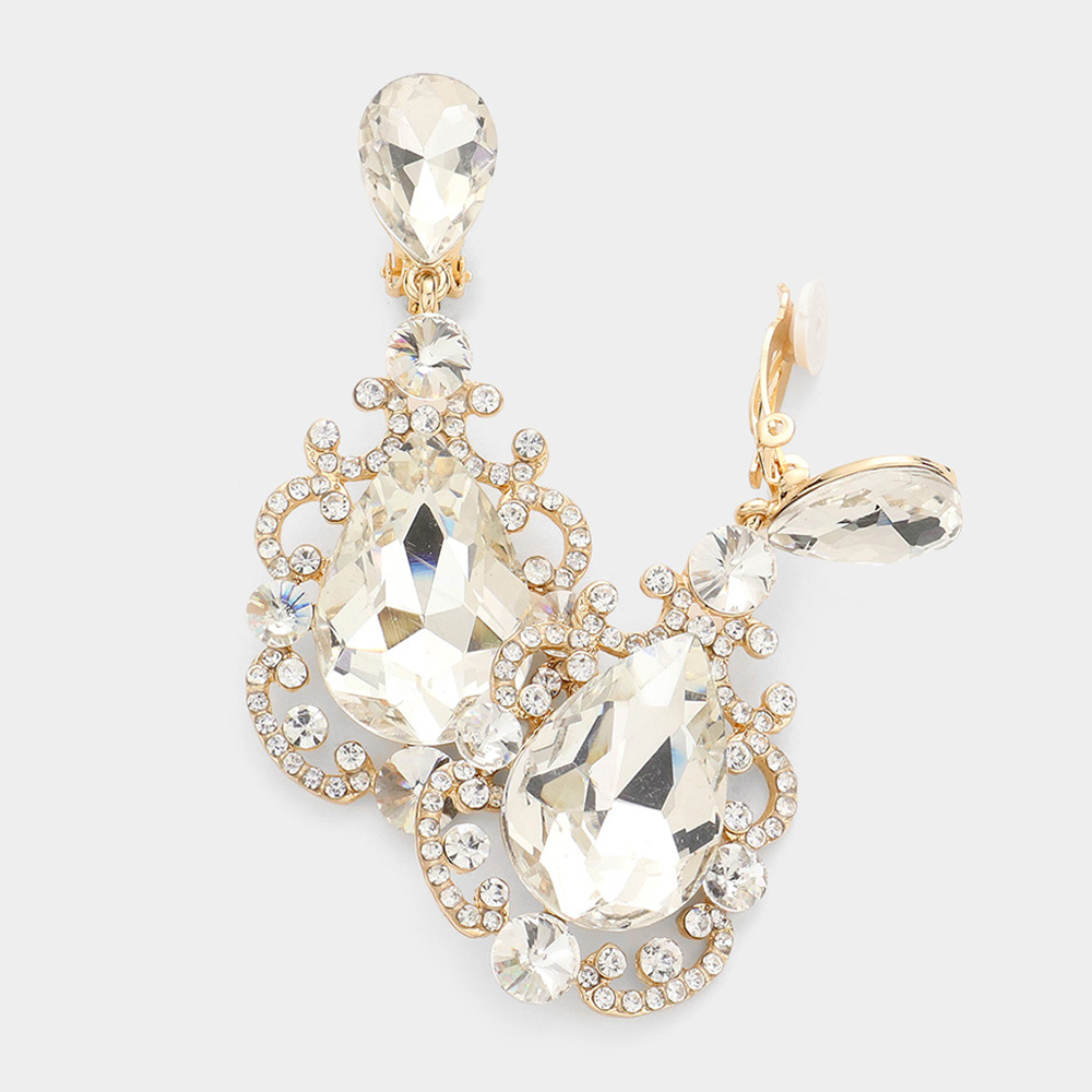 Teardrop Crystal Dangle Evening Clip on Earrings