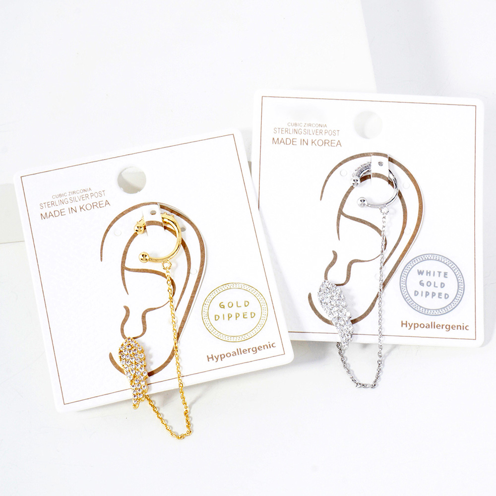Details • Size : 0.8" X 2.2" • This gold-dipped chain earring features a stunning wing design adorned with sparkling cubic zirconia, linked elegantly to a matching ear cuff. Crafted with hypoallergenic sterling silver posts, it offers a perfect mix of glamor and comfort for modern, sophisticated styling. • CZ Cubic Zirconia • Gold Dipped • Hypoallergenic • Lead and Nickel Compliant • Made In Korea • Sterling Silver Post