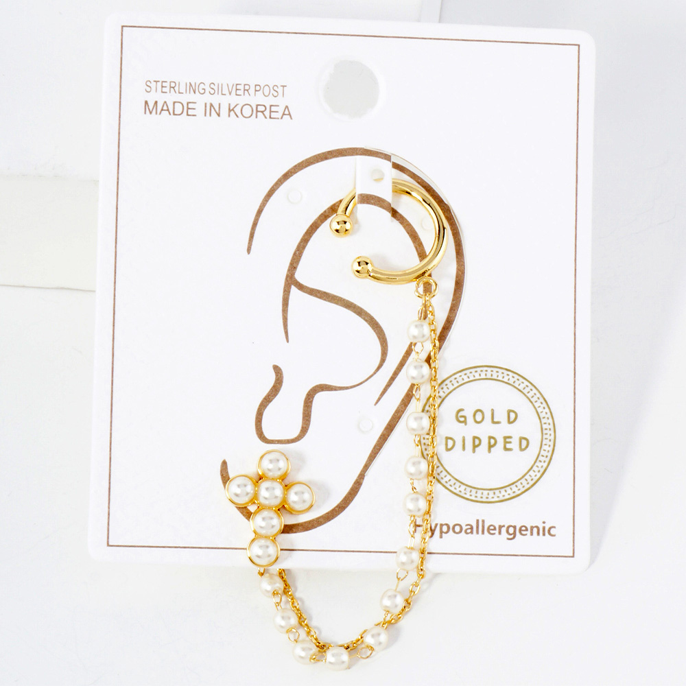 Gold Dipped Pearl Cross Chain Ear Cuff Earrings