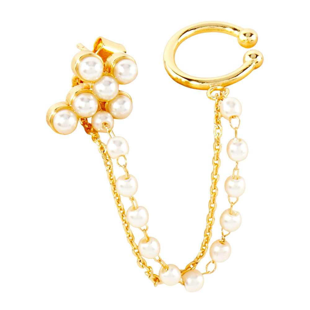 • This elegant gold-dipped chain earring showcases a cluster of luminous pearls connected to a matching ear cuff by dual pearl-accented chains. Crafted with hypoallergenic sterling silver posts, it combines timeless grace and modern sophistication, perfect for both casual and formal wear.