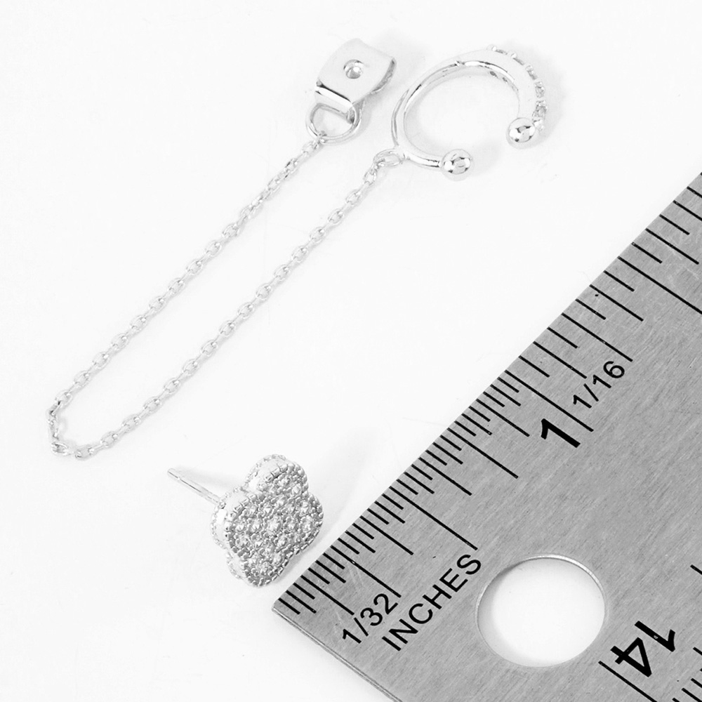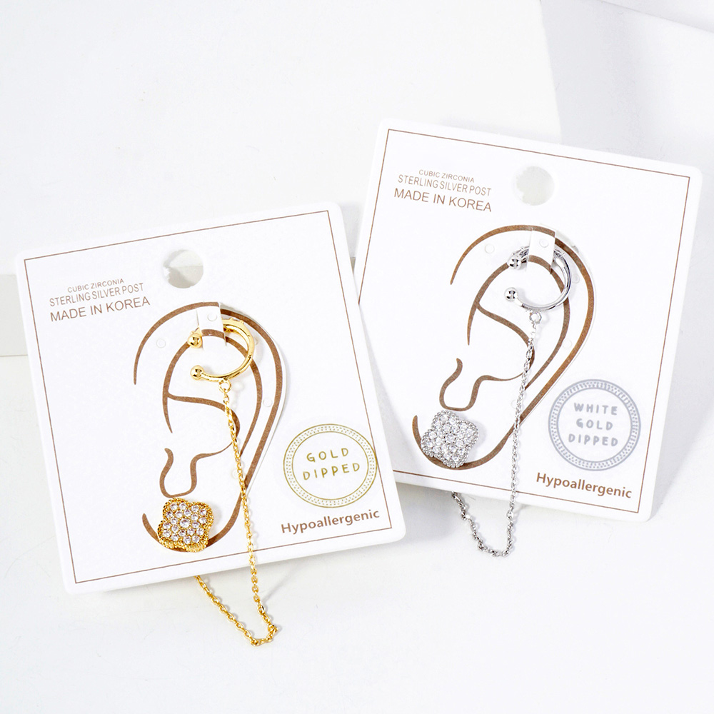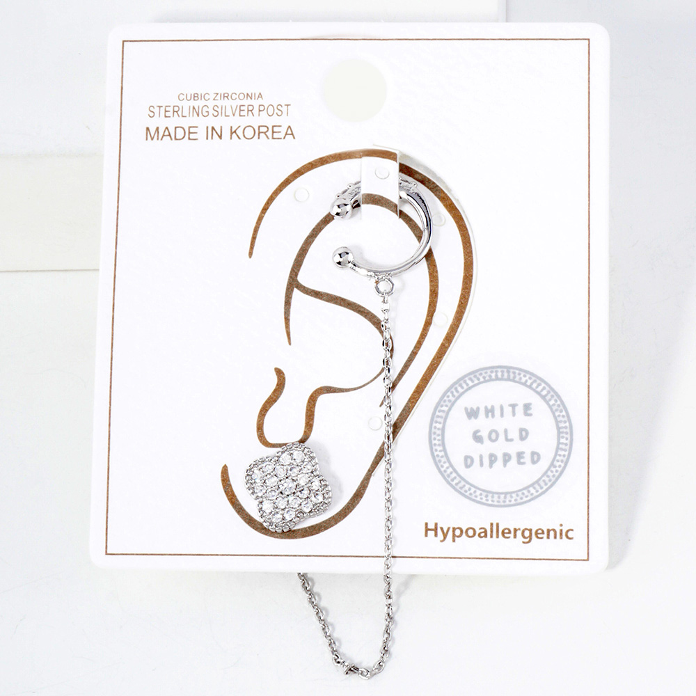 Details • Size : 0.8" X 2.2" • This white gold-dipped chain earring features a sparkling clover charm linked to a sleek ear cuff, offering a chic and elegant design. Adorned with cubic zirconia and crafted with hypoallergenic sterling silver posts, it’s a modern accessory perfect for effortless sophistication. • Lead and Nickel Compliant • Hypoallergenic • Made In Korea • Gold Dipped • CZ Cubic Zirconia • Sterling Silver Post