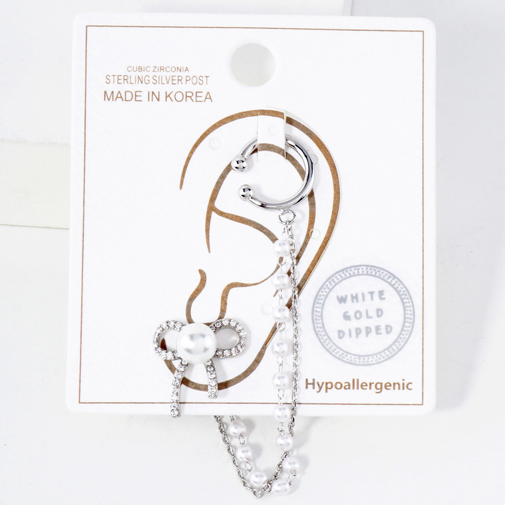 Details • Size : 1" X 2.2" • This white gold-dipped chain earring features a graceful bow adorned with cubic zirconia and a lustrous pearl centerpiece, connected to an elegant ear cuff by dual pearl-accented chains. Designed with hypoallergenic sterling silver posts, it offers a refined and feminine touch for any occasion. • Lead and Nickel Compliant • Hypoallergenic • Made In Korea • Gold Dipped • CZ Cubic Zirconia • Sterling Silver Post