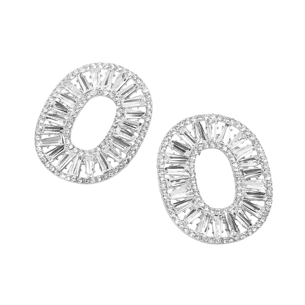 • Turn heads with these stunning oval-shaped earrings featuring a striking geometric crystal arrangement and sparkling accent border. Their bold, elegant style adds instant glamour to evening looks, making them the perfect choice for formal events or festive occasions.