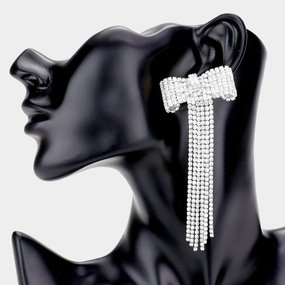 Bow Accented Rhinestone Long Drop Evening Earrings