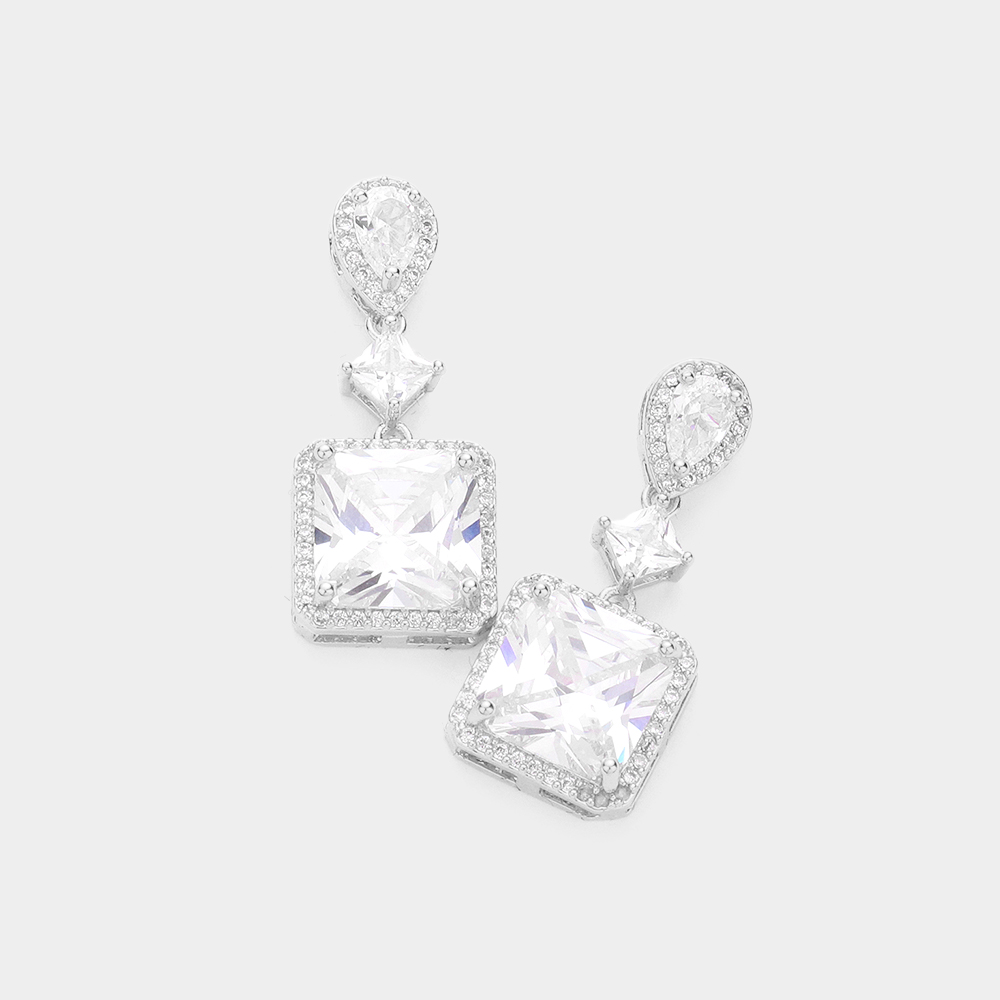Emerald Cut Stone Accented Rhinestone Fringe Dangle Evening Earrings