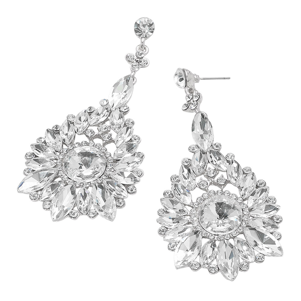 Details • Size : 1.6" X 3.7" • Post Back • Make an unforgettable impression with these statement teardrop crystal earrings. Designed with intricate faceted stones in a radiant arrangement, they capture light beautifully for a luxurious look—perfect for evening events, weddings, and glamorous nights out.