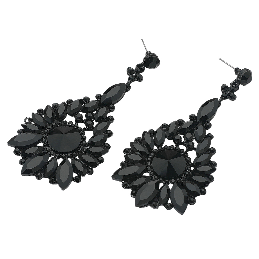 Details • Size : 1.6" X 3.7" • Post Back • Make an unforgettable impression with these statement teardrop crystal earrings. Designed with intricate faceted stones in a radiant arrangement, they capture light beautifully for a luxurious look—perfect for evening events, weddings, and glamorous nights out.