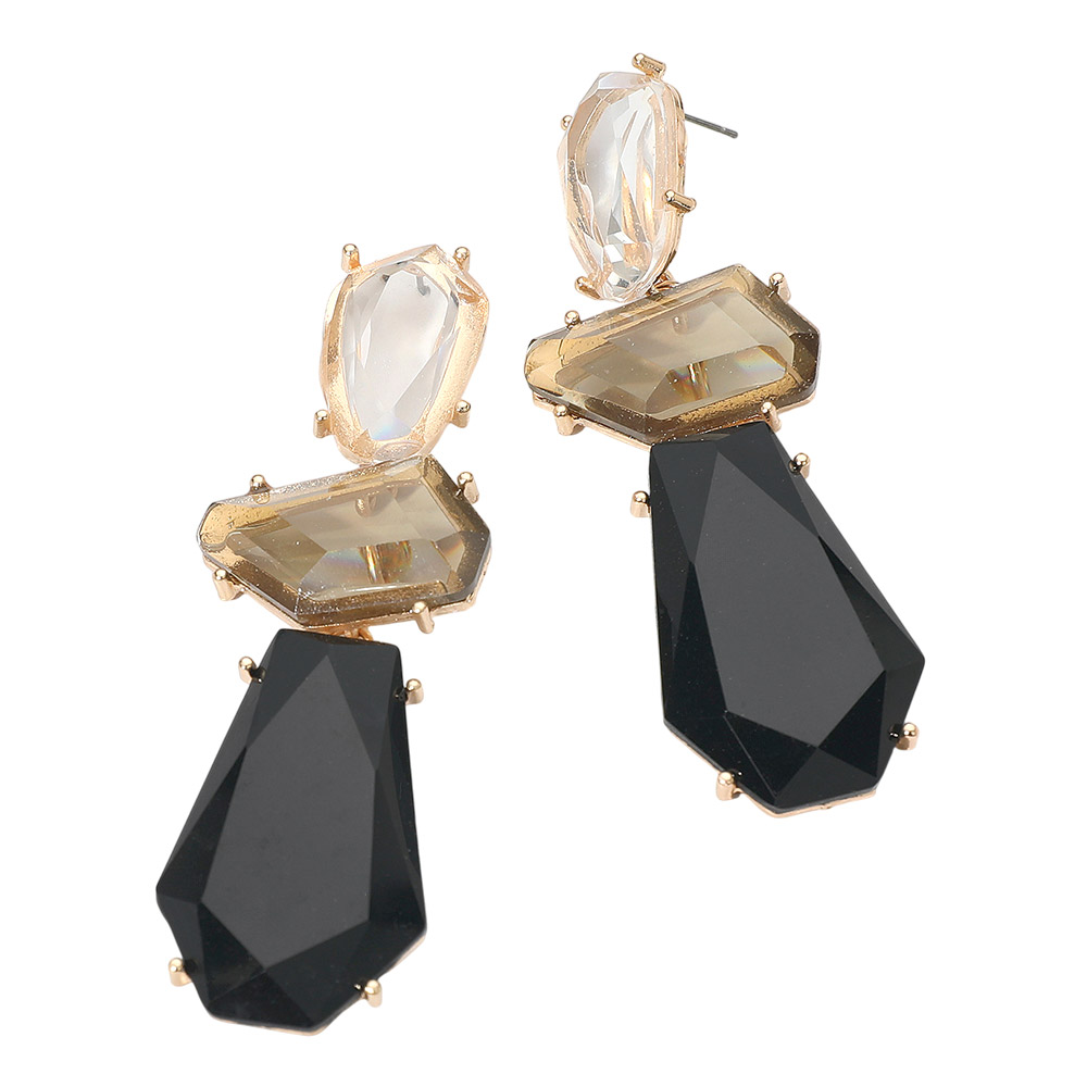 Details • Size : 1.25" X 3.25" • Post Back • Make a bold statement with these geometric three-stone drop earrings. Featuring an artful mix of faceted stones in a modern tiered design, they capture light beautifully for an effortlessly elegant look. Perfect for adding sophistication and drama to any outfit. • Lead and Nickel Compliant