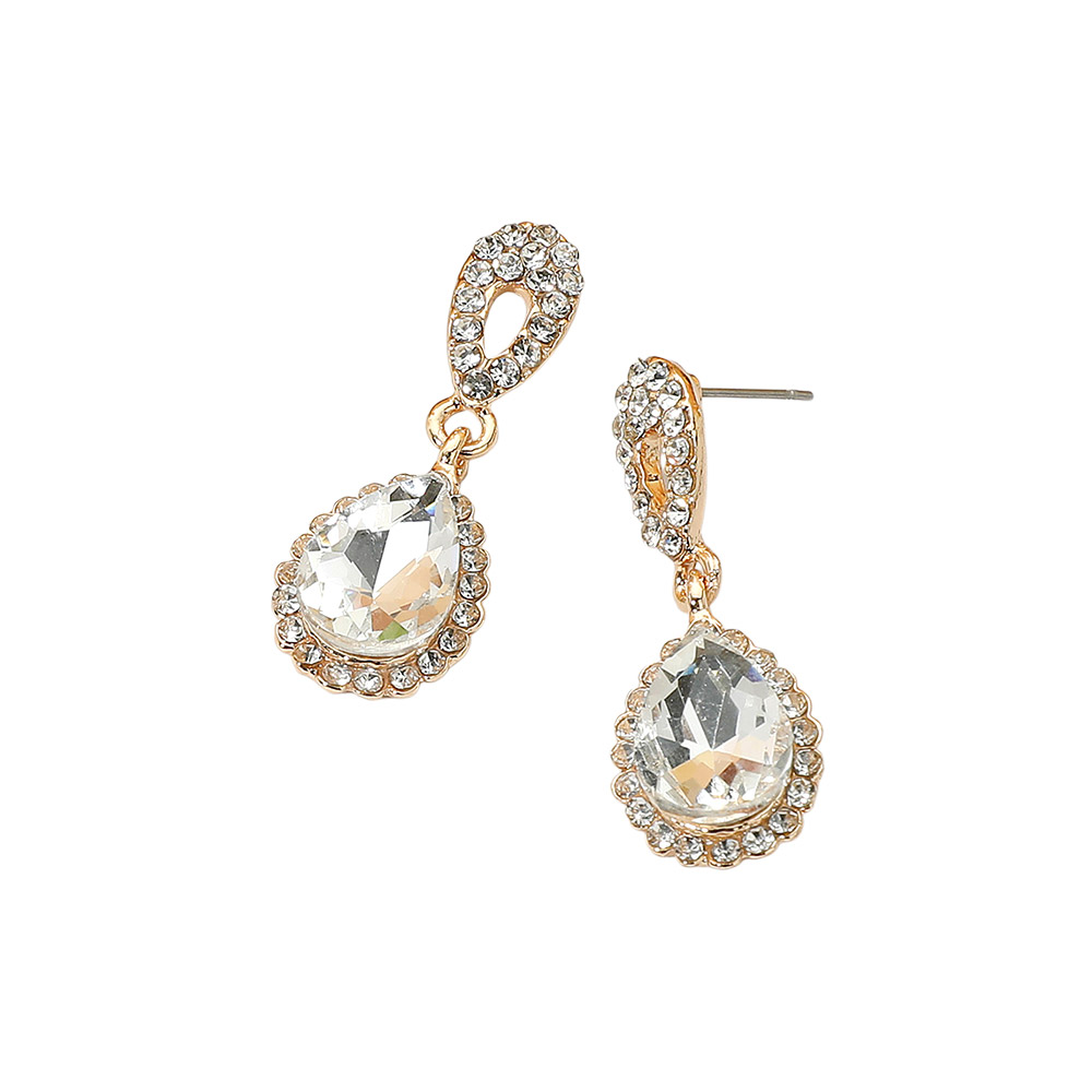 • Make a dazzling entrance with these elegant Teardrop Crystal Dangle Earrings. Each earring features a brilliant, large pear-shaped stone with an iridescent, rainbow-like shimmer, suspended beneath an oval link paved with smaller, sparkling gems. The highly faceted stones catch and reflect light from every angle, creating a spectacular glow. These statement earrings are perfect for bridal jewelry, proms, galas, or any formal event where you want to add exceptional sparkle and sophistication.