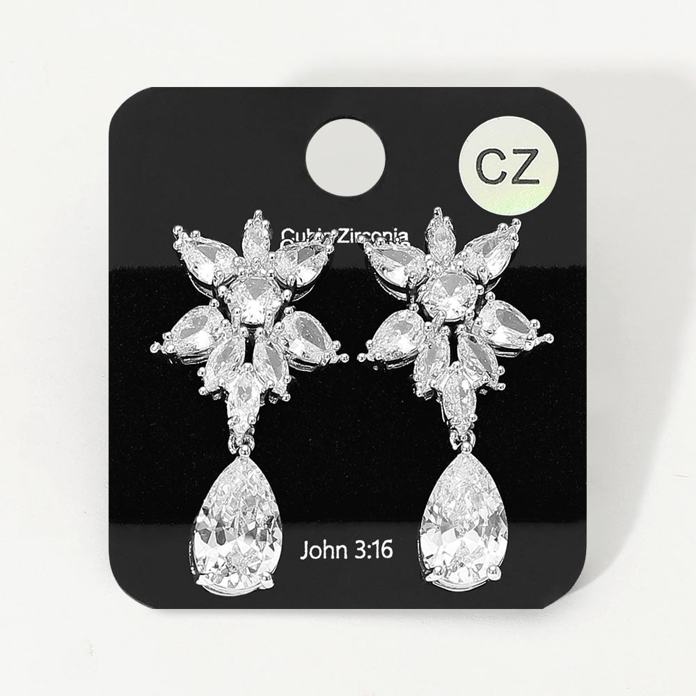 Details • Size : 0.75" X 1.5" • Post Back • These teardrop cluster cubic zirconia drop earrings dazzle with a radiant mix of marquise and pear-cut stones arranged in a floral-inspired pattern. Designed for special occasions, they deliver brilliant sparkle and timeless sophistication, making them a standout accessory for elegant looks. • CZ Cubic Zirconia • Lead and Nickel Compliant