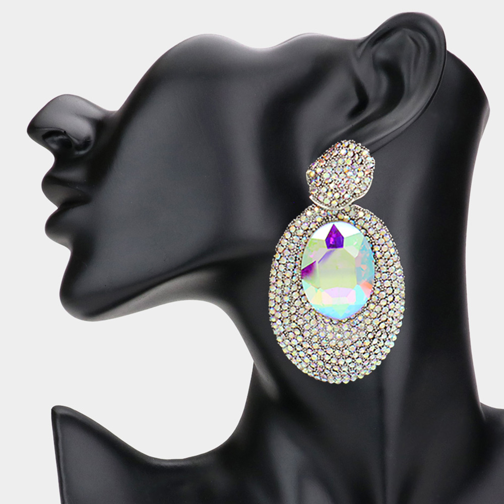 Oval Glass Stone Pointed Rhinestone Paved Dangle Evening Earrings