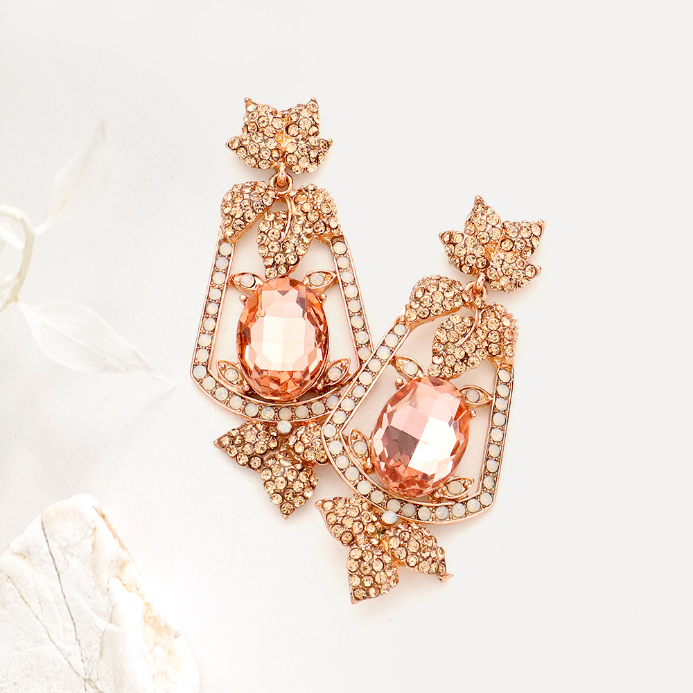 Oval Stone Accented Rhinestone Leaf Evening Dangle Earrings