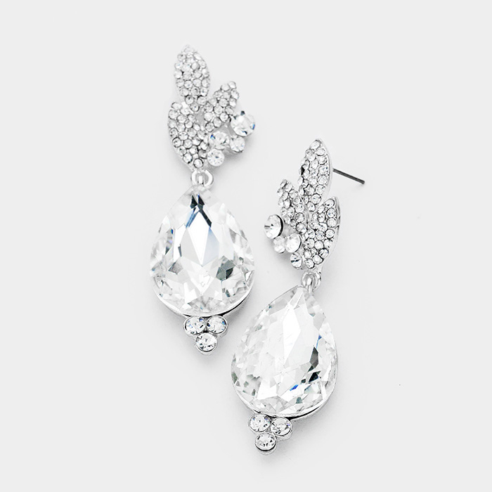 Rhinestone Pave Leaf Crystal Teardrop Evening Earrings