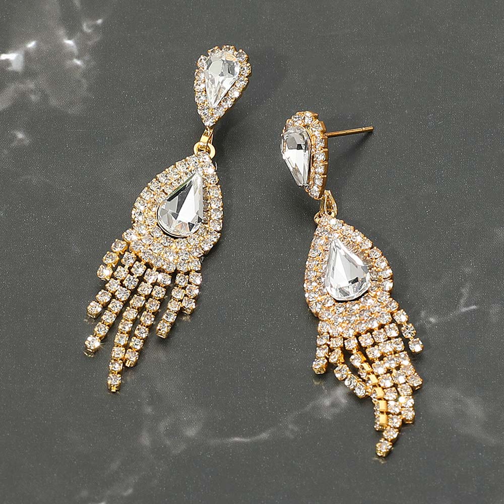 Details • Size : 0.5" X 2.25" • Post Back • Dramatic teardrop crystal fringe earrings featuring layered halos and cascading strands for a bold, sparkling finish. Their elongated silhouette adds radiant movement, making them perfect for evening events, formal occasions, weddings, or any look that calls for high-impact glamour and shine.