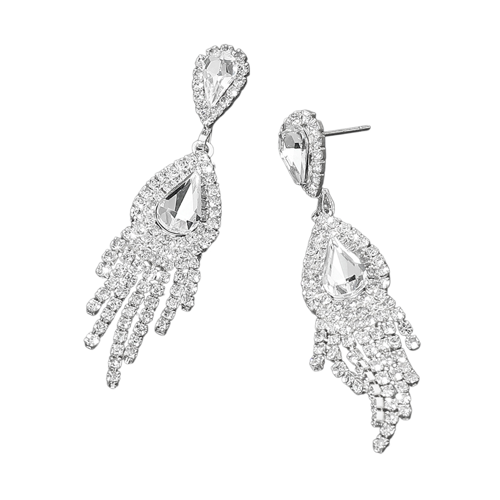 Details • Size : 0.5" X 2.25" • Post Back • Dramatic teardrop crystal fringe earrings featuring layered halos and cascading strands for a bold, sparkling finish. Their elongated silhouette adds radiant movement, making them perfect for evening events, formal occasions, weddings, or any look that calls for high-impact glamour and shine.