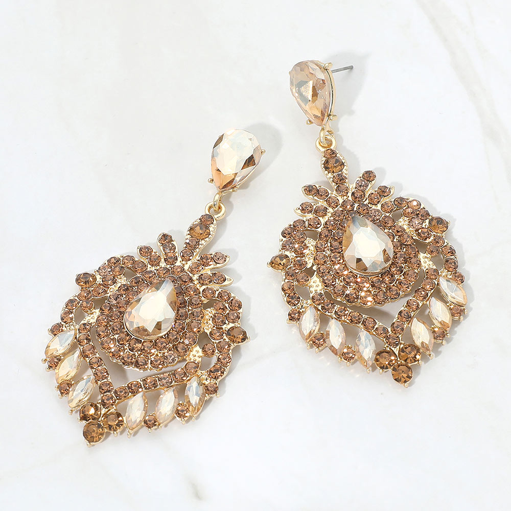Details • Size : 1.5" X 3.1" • Post Back • These statement crystal drop chandelier earrings feature an intricate layered design with faceted accents that catch the light from every angle. Designed to elevate evening looks, weddings, and special events, they add bold sparkle and refined glamour while remaining comfortable to wear. A striking accessory that instantly enhances dresses, formal outfits, or party-ready styles. • Lead and Nickel Compliant