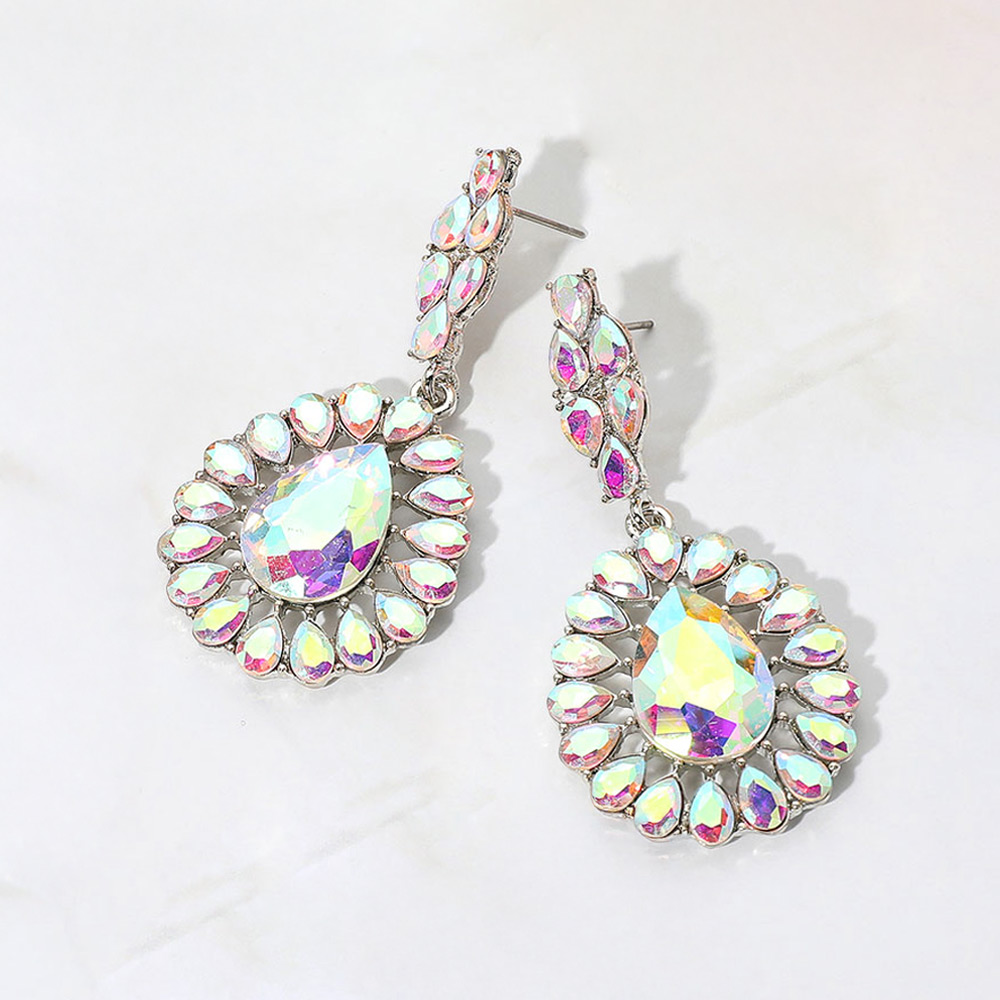 • Shine with elegance in these vintage-inspired teardrop crystal drop earrings. Featuring a radiant halo of faceted stones around a striking center gem, they’re perfect for weddings, galas, or festive events. A timeless statement piece that adds sophistication to any outfit.