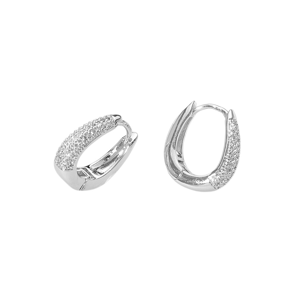 White Gold Dipped CZ Stone Paved Oval Huggie Hoop Earrings