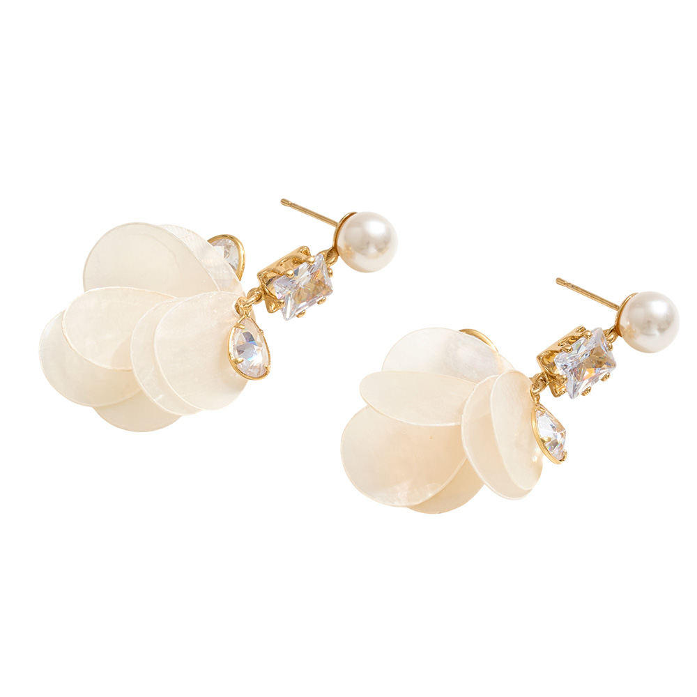 Details • Size : 0.75" X 2" • Post Back • These drop earrings combine luminous shell-like discs with a pearl stud and sparkling crystal accents for a statement-making design. Elegant yet playful, they bring texture and shine, perfect for adding a touch of modern charm to both day looks and evening outfits. • Lead and Nickel Compliant • Hypoallergenic • Made In Korea • Gold Dipped • Brass