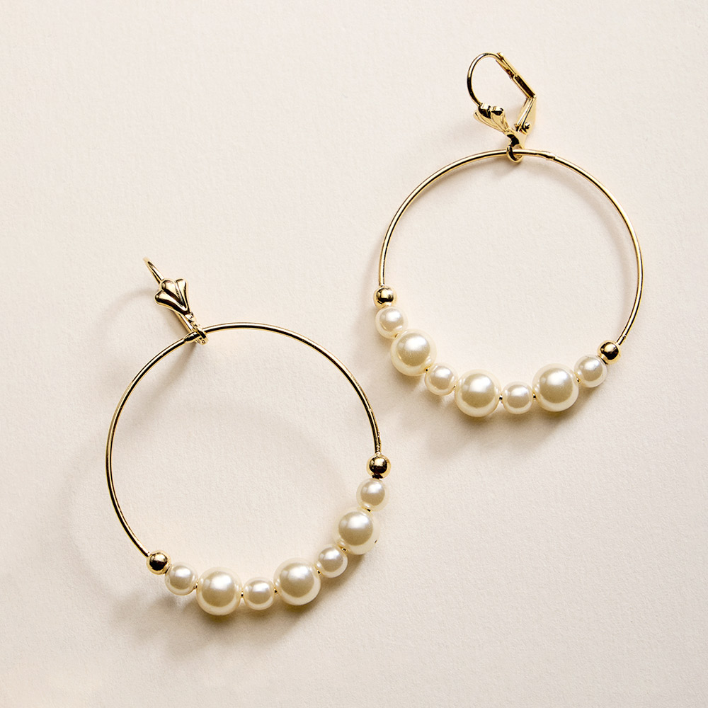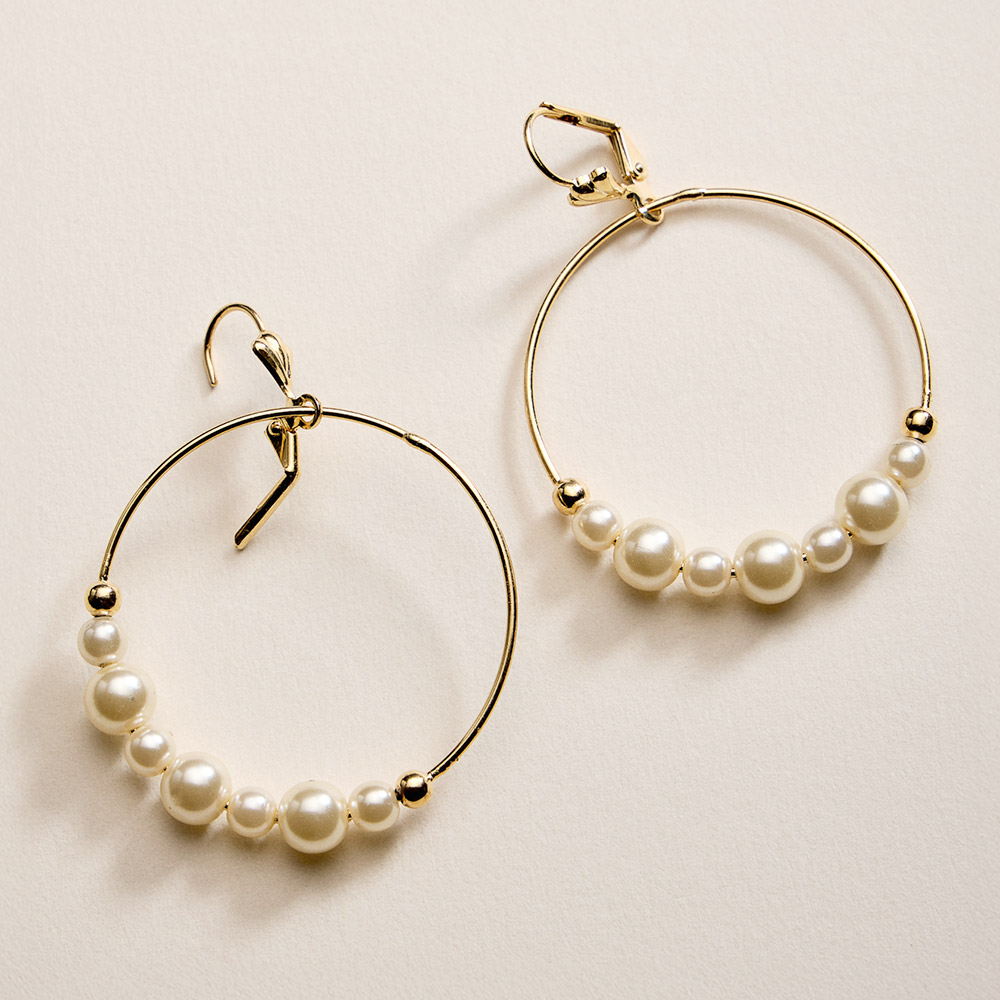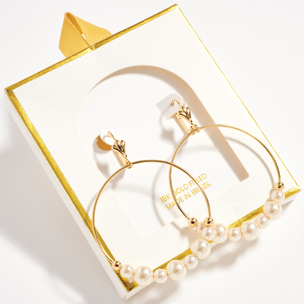 Details • Size : 1.6" X 2.3" • Lever Back • Elegant hoop clip earrings designed with a smooth circular silhouette and a row of pearl style accents for a polished, timeless look. Lightweight and easy to wear, these hoops add refined charm to everyday outfits, special occasions, bridal styling, and gift-ready jewelry collections for boutiques and fashion retailers. • Gold Filled • Hypoallergenic • Lead and Nickel Compliant • Made In Brazil