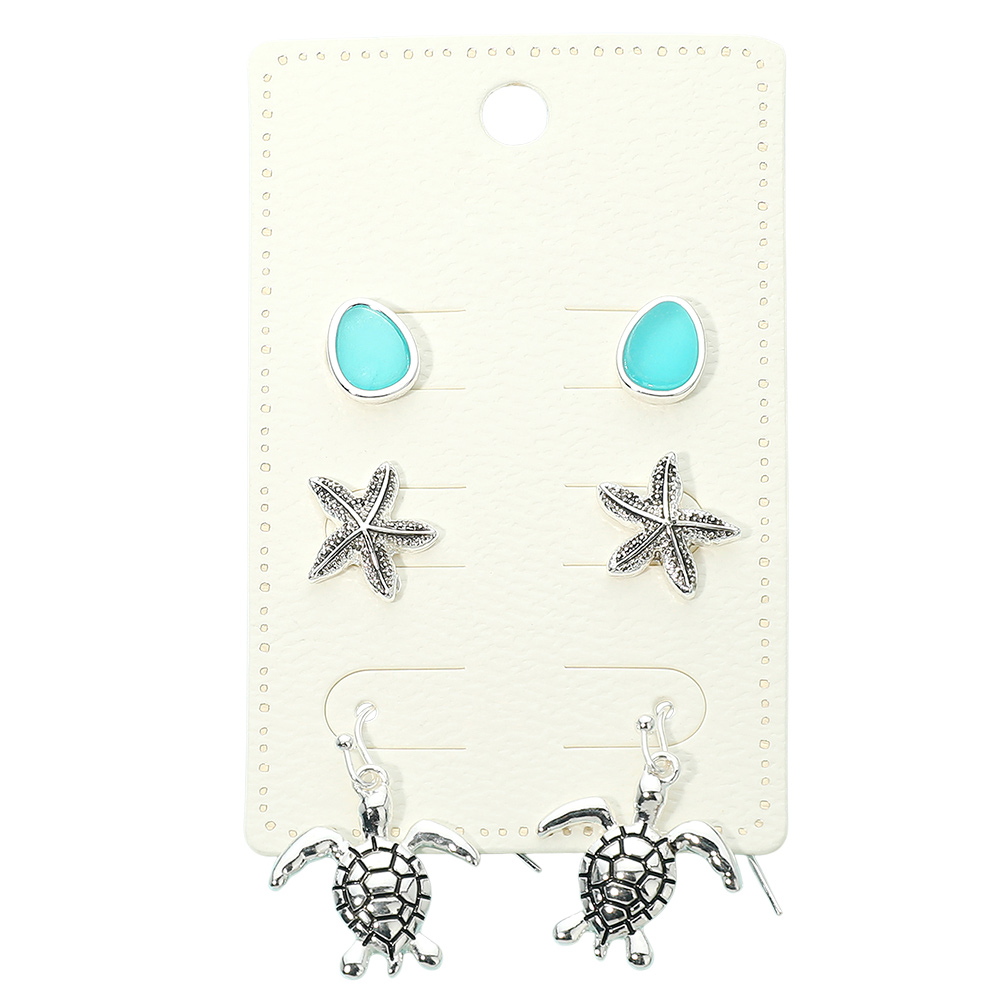 Details • Size : 0.4" - 1.25" L • Post Back, Fish Hook Back • Versatile three-pair earring set featuring ocean-inspired designs with smooth studs, textured star shapes, and playful dangling turtle accents. This coordinated assortment offers styling flexibility for everyday wear, vacations, or themed collections while adding charm and variety to any jewelry display. • Lead and Nickel Compliant