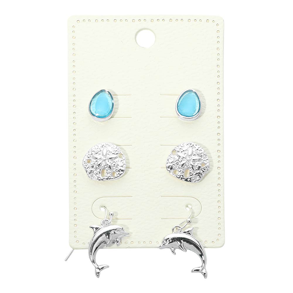 Details • Size : 0.4" - 1.24" L • Post Back / Fish Hook Back • This stud earring set includes three distinct designs featuring smooth teardrop studs, textured round studs, and playful dolphin charm drops. Designed for easy mix-and-match styling, this versatile set adds variety to everyday looks and makes a great choice for gift shops, resort collections, and ocean-inspired seasonal assortments. • Lead and Nickel Compliant