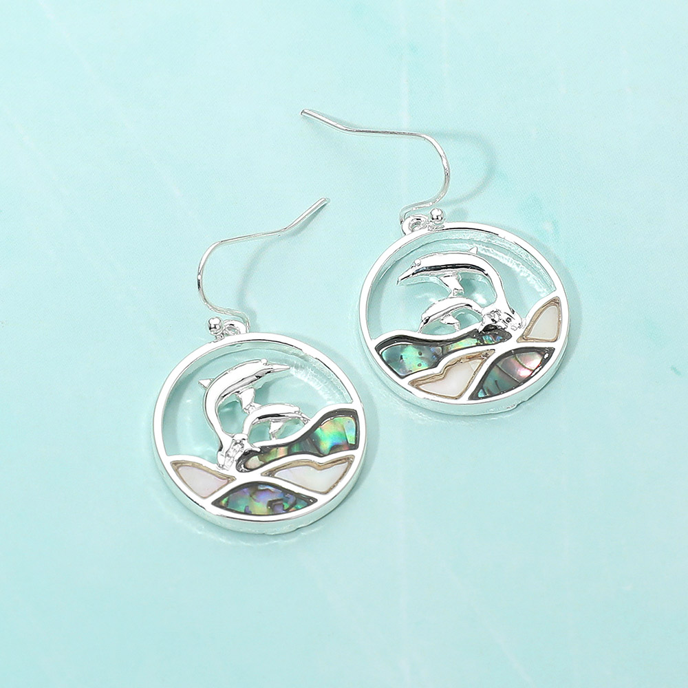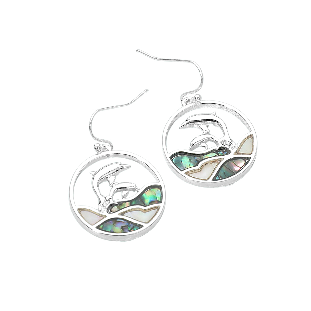 Abalone Double Dolphin Wave Round Dangle Earrings Abalone Double Dolphin Wave Round Dangle Earrings